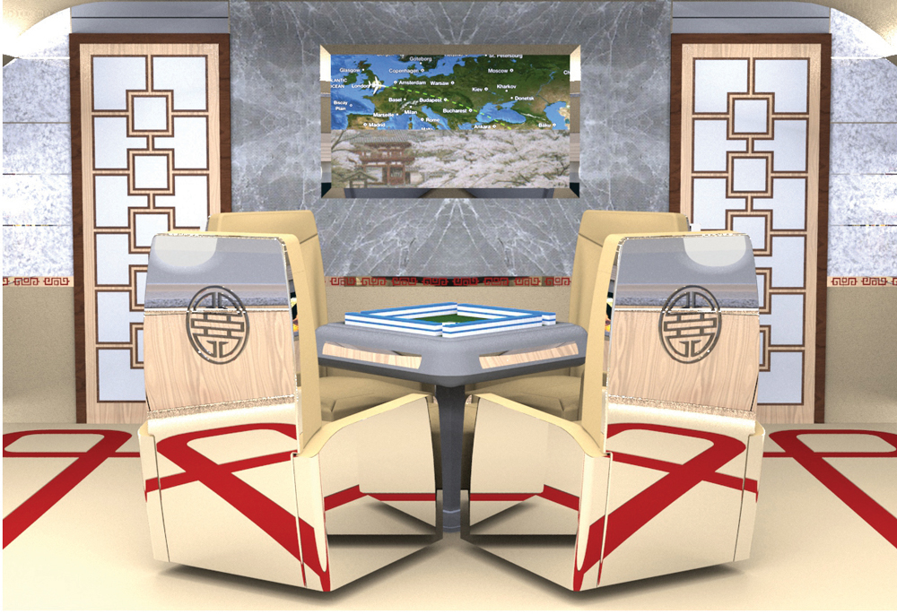 Responding to requests from a growing Asian market, Jeff Bonner Research and Development, an aircraft parts manufacturer, has developed a custom automatic Mahjong table for private jet installations. Actually, the company has designed a whole semi-private, Asian-arts inspired Mahjong room to go with the table.